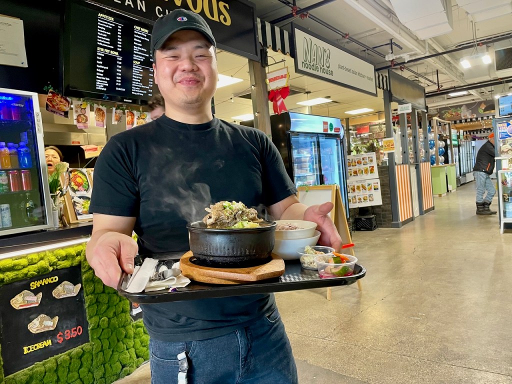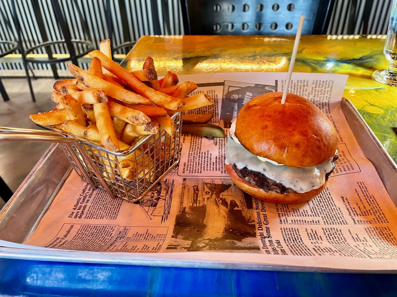It’s a hell-of-a-lunch special, down from the regular $23.75, and includes a wire basket of hot fries. The Wagyu beef certainly delivers—a melt-in-your-mouth patty, topped by caramelized onion, smoked cheddar, house pickle coins and Bizarre sauce, in a soft potato bun. Actually, with a patty this good, you might want to cut back on potentially distracting toppings.