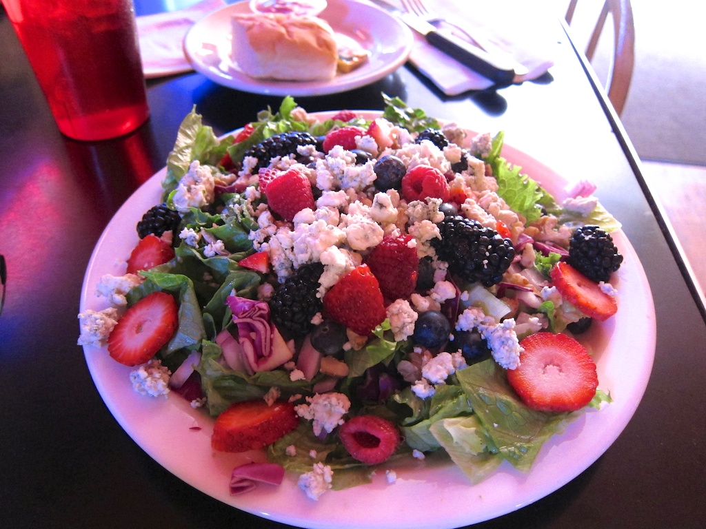 After a vigorous hike up the dusty lower Barr Trail, I’m hungry for something healthy. But my first choice, the lovely streamside Adams Mountain Cafe—with its devotion to slow, vegetarian-focused cuisine—has a lunchtime lineup. So I ask an exceedingly friendly gallery owner for suggestions and she recommends a berry salad… in a bar? I’m dubious as I enter Keg Lounge, with its dim lighting, long row of Bud-sipping patrons on bar stools, central pool table and classic rock soundtrack. But I do order the berry salad and am stunned when it arrives. It’s a mountain of fresh raspberries, blackberries, blueberries and sliced strawberries over a bed of greens, blue cheese and walnuts. It’s the most fruit I’ve eaten in weeks. The Keg also does a nice half-pound burger, served on a long bun. It also goes against the bar grain by having no deep fryers in the open kitchen.