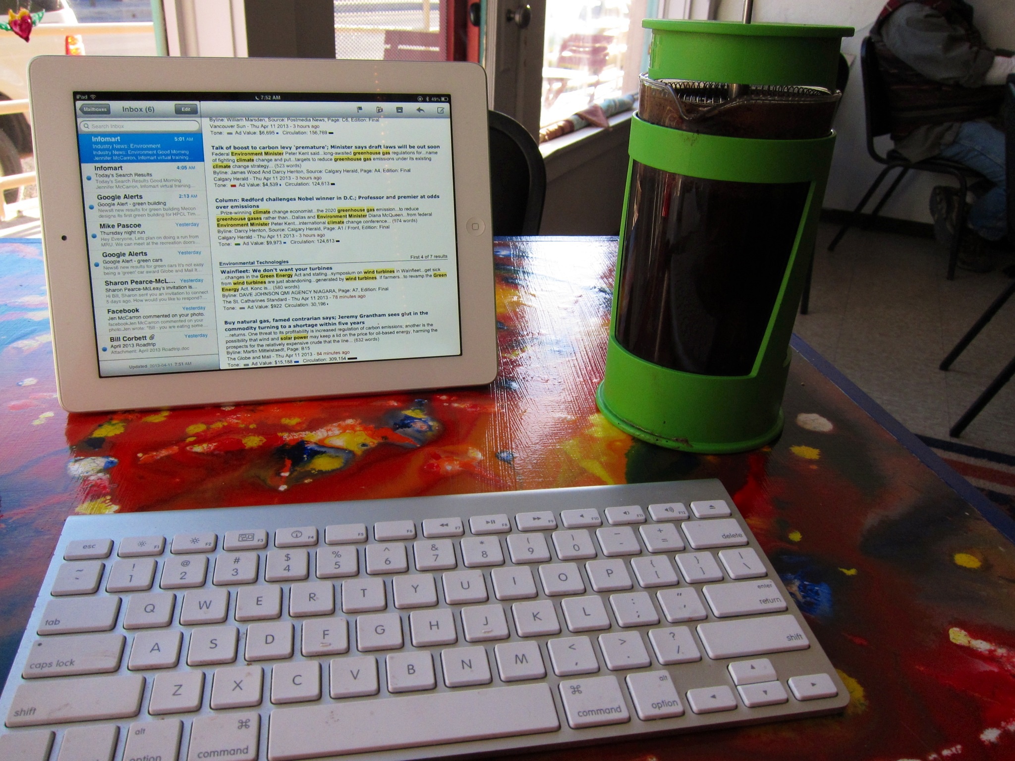 I’m typing away on my iPad in a coffee shop while drinking a big pot of French press coffee. “You’re wired,” a woman says. Yes and yes.