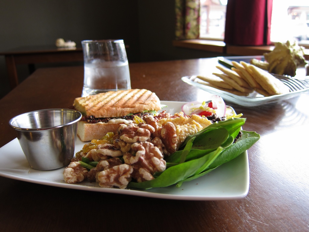 You’d think it would be hard to distinguish yourself if you offered the usual lunchtime fare of paninis, wraps and salads, especially if you’re located in a nondescript strip mall on the main drag of Columbia Falls, just outside of Whitefish. Yet *The Palette Cafe pulls it off, and they do it the usual way: with imagination, attention to detail and presentation. Take, for instance, the first-class ingredients in my BLT panini—perfectly crusted bread enveloping maple bacon, truffle bechamel, sharp cheddar and arugula. The extra details are a lovely little cup of house-made mustard, an unusually shaped water glass and my ability to combine a half panini with a small salad of hummus, walnuts, spinach and nicely warmed pita triangles. The presentation is enhanced by the artistic way everything is laid out on the plate. A final nice gesture is when one co-owner (a young couple owns the place and her parents help out) sees the panini slopping around my face, as usual, and brings over a couple more napkins.