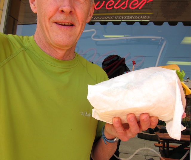 “How much does it weigh?” I warily ask my assembler. “Oh, about a pound,” he says, straight faced. Right. I order half a Big John ($7), sans bologna, and sit back to watch the laying on of meats. After a flurry of activity, he hands me the wrapped sandwich, which I immediately place on a professional scale. It’s just shy of 1-3/4 pounds. One-and-three-quarter freaking pounds for half a sandwich. That’s almost the weight of a litre bottle of water.