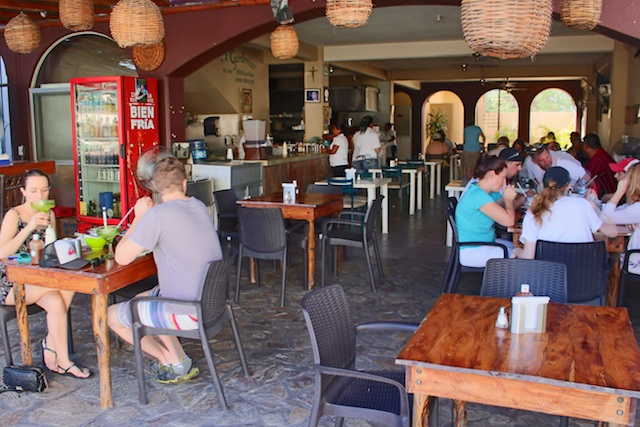 It’s a long, windowless space, open at both ends to provide a cooling mid-day breeze. Friendly women move casually but efficiently through the space, taking orders in Spanish. Within minutes, they return with, not chips and salsa, but meals hot from the grill, accompanied by all manner of toppings in little steel containers.