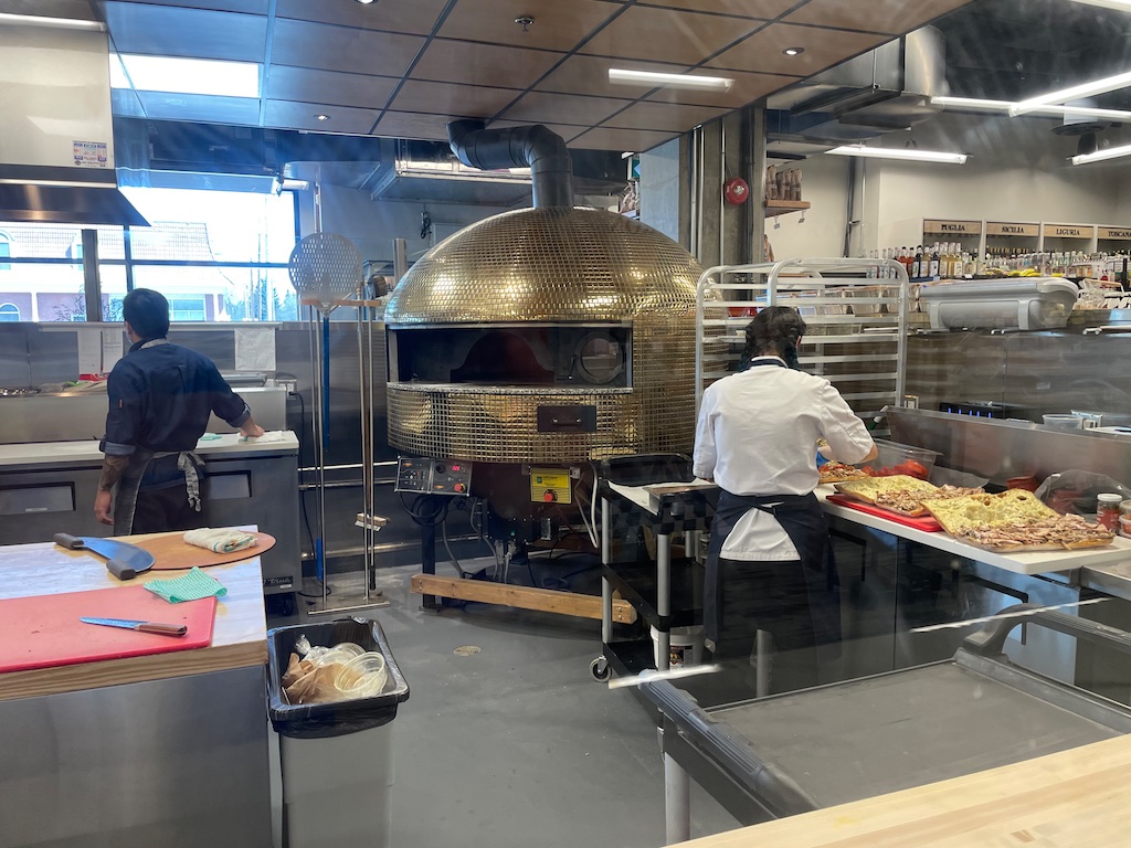 How cheap? Consider my first purchase: an eight-inch wild boar bacon, mozza and marinara pizza for only $8. Four thin-crust, slightly spicy slices, nicely blistered after a few minutes in the big, domed oven.