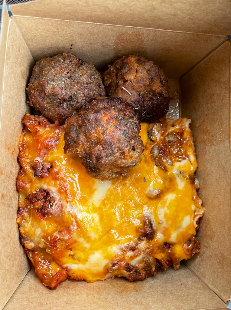 Yes, the meals were in steamer trays (i.e. not made to order). But that didn’t affect the quality of what I ordered: a big slab of meaty, cheesy lasagna.
