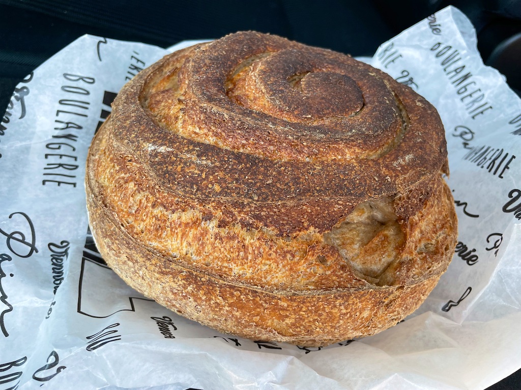 French 50 is kind of like a pop-up restaurant, open only on Saturdays, although doing a brisk online, pick-up business. Owners Marie and Brad bake a range of fabulous, crusty sourdough breads, such as the pain campagne, a whole wheat naturally raised loaf that I order.