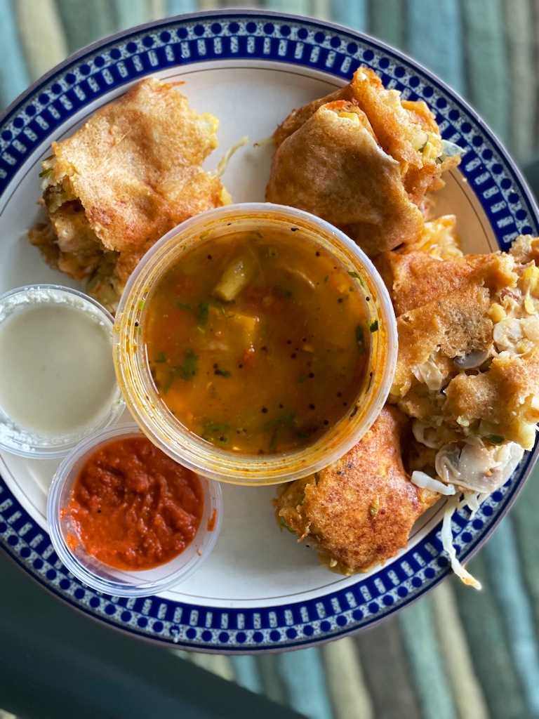I opted for a Chennai delight dosa, featuring stuffed masala, corn, mushrooms and other vegetables. It certainly was a bountiful delight, with some six chunks of silky dosa, plus a soup and two containers of dips, a two-meal deal for $13.