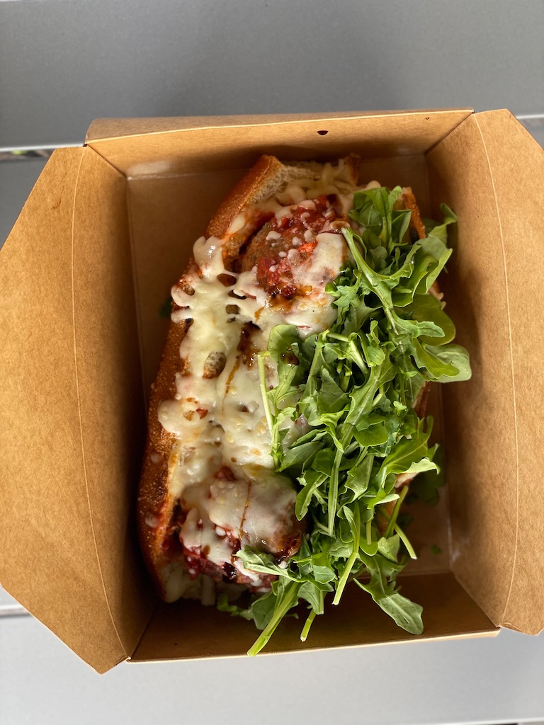 But there’s still plenty of room for yet another offering to squeeze into this cheap-eats lunch series. It’s a fabulous three-meatball hero sandwich, in a house-made focaccia bun—with tomato sauce, a balsamic glaze and a sprinkling of baby arugula—for only $10.