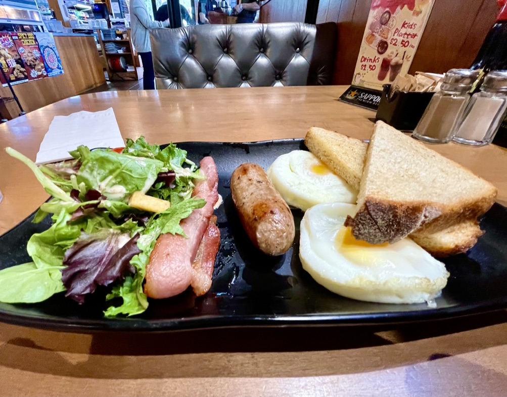 What really catches my eye is a standard Canadian breakfast—two eggs, a strip of bacon, a nice little sausage, sourdough toast and a wee mixed salad—all for $5.