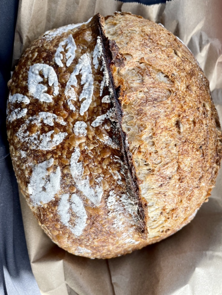 Before ordering food, I snagged a Viking sourdough loaf; the breads tend to disappear by early afternoon. Then it was on to the main attraction— a fine pork loin galette, served open faced and best tackled with a knife and fork—washed down with a nice coffee and a fruit brioche.