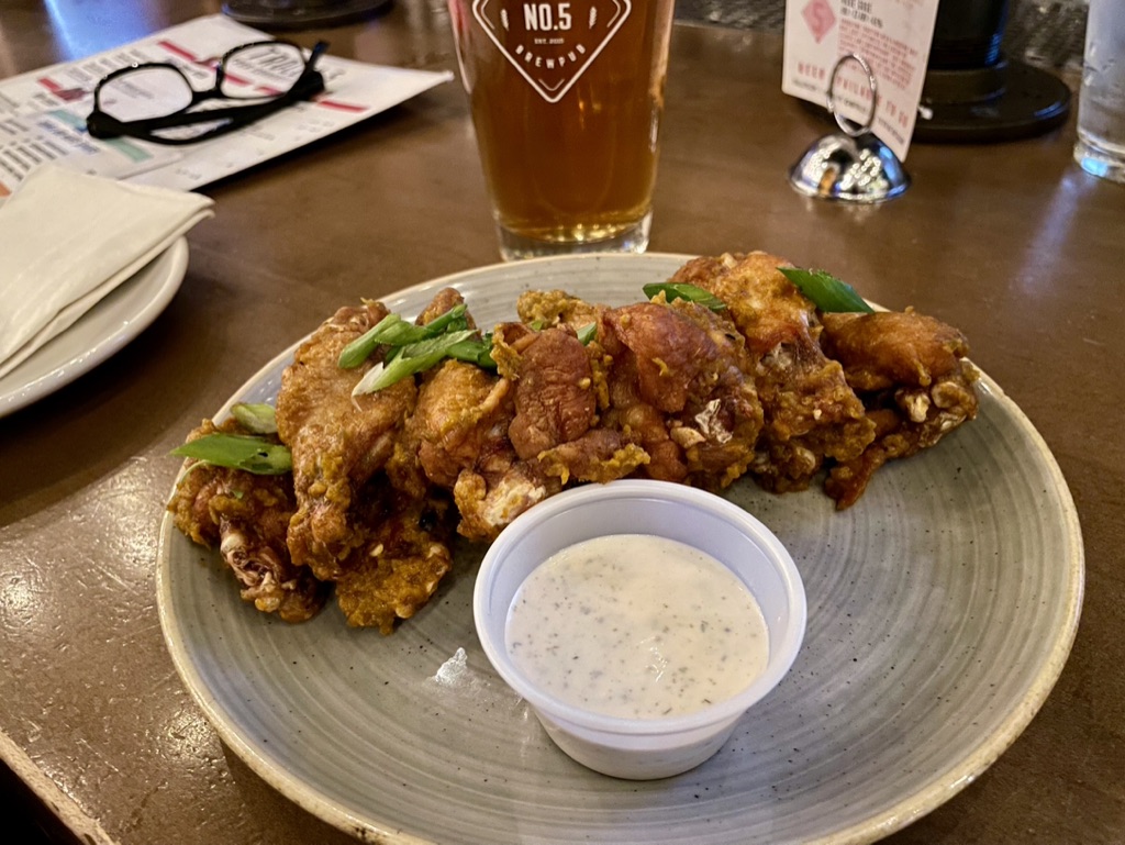 But it was a lot of fun, even for me, a Marathon Mouth diner and drinker who goes out of his way to avoid crowded peak hours.Most important, the beer was tasty; in our case pints of High Five IPA at happy-hour pricing. And the food, often a taproom afterthought, was exceptional—an expansive menu ranging from charred romaine hearts to duck confit banh mi. Our smoking hot wings were among the best I’ve had, and the house-smoked brisket sandwiches divine.
