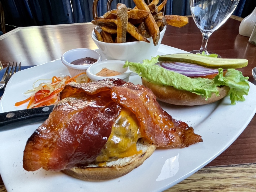 What seals the deal for me is when my server asks how I’d like my burger cooked, from rare to well done; Medium rare, please! It’s been many years since I was offered that choice in germ-conscious Canada.