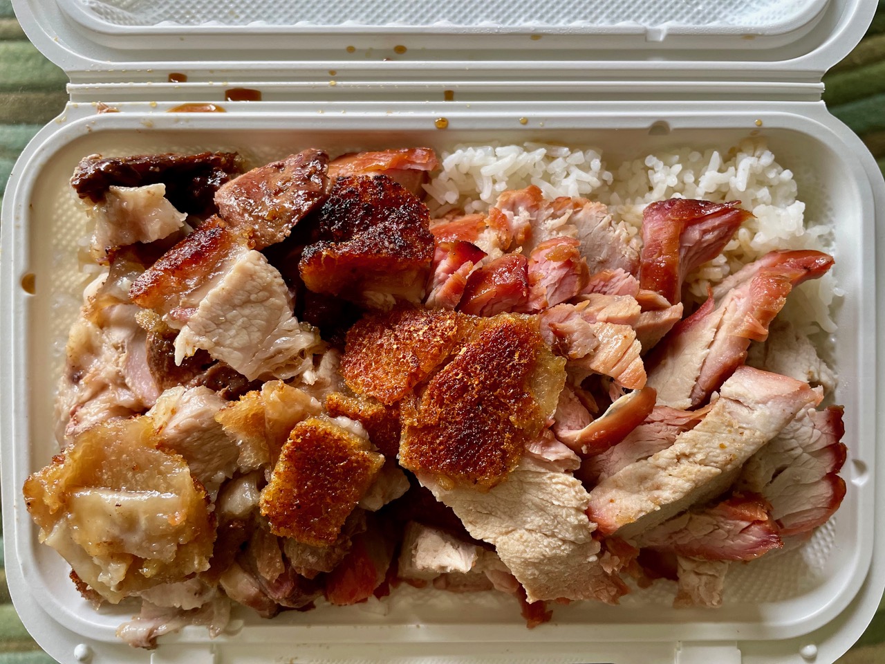 And now the colourful really begins: a cleaver-wielding worker starts hacking your chosen meats into bite-sized pieces. These are all stacked atop a mountain of white rice in a takeout container now weighing 29 ounces. And costing $11, cash only.