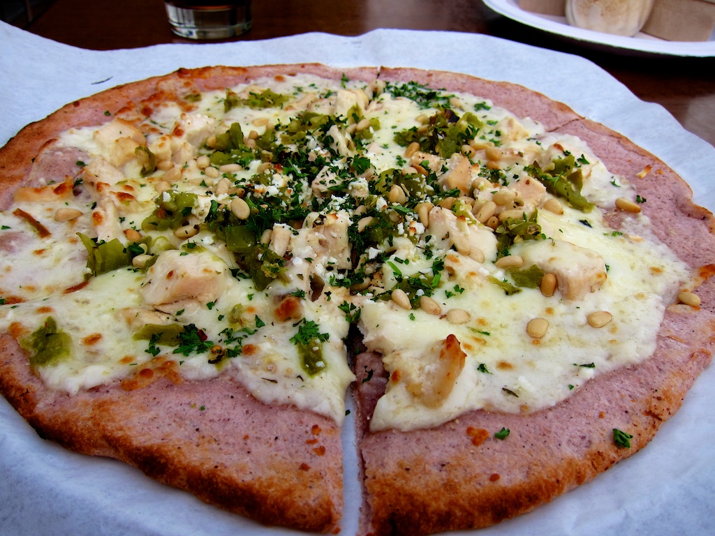 This Rooftop pizza has a New Mexico twist with a blue-corn crust, pinon nuts and green chile