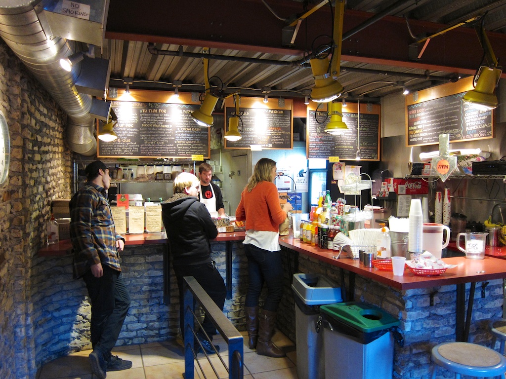 A friend and I both order the house-ground burger, a massive nine ounces of a unique blend of sausage and beef (70-30%), accompanied by a pile of Parmesan fries and homemade ketchup. Partway through the grill-top cooking, co-owner Connie DeSousa (she finished third in Top Chef Canada; check out the tattoo on her arm), peers over the counter and asks if we’d like an egg and some aioli spread on that burger. After nodding yes, we tuck into these juicy monsters, held together with thick, gooey cheese and a bun that miraculously survives the mauling. Sure, it costs $17, but for one of the better and bigger burgers I’ve had anywhere, it’s still good value. And if we’d paid attention to the name, the Share burger, we could easily have split it.