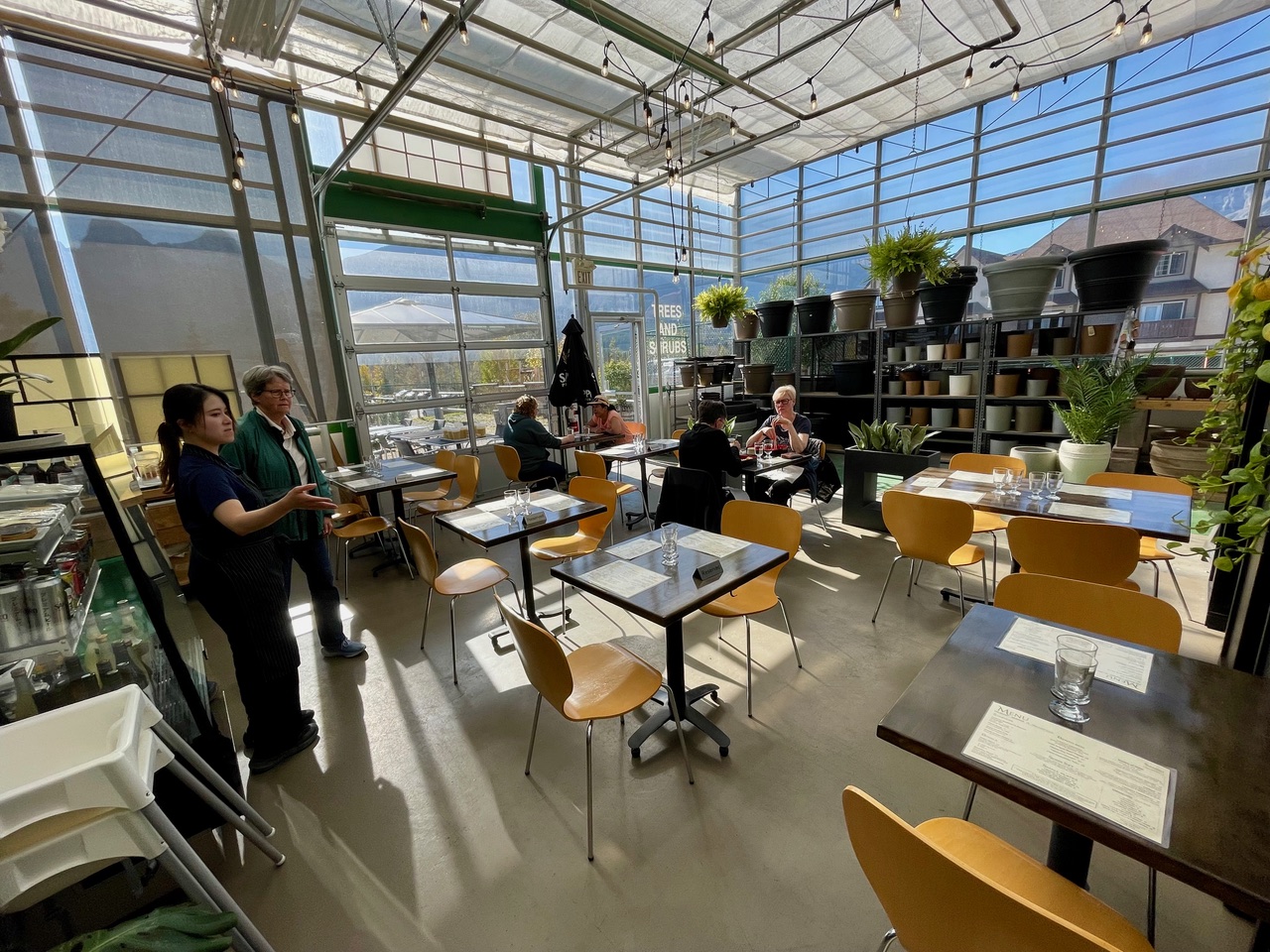 Wagashi Tea House is a delightful surprise—a verdant retreat attached to a Canmore garden centre in an industrial neighbourhood far from the cacophony of downtown. Its greenhouse-like walls and ceiling allow plentiful light and views of the surrounding mountains.