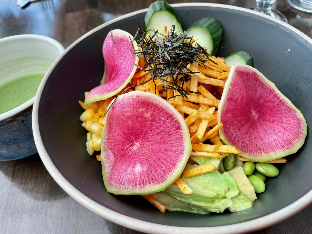 My poke bowl ($24) is a wonderful mix of raw tuna, wonton crisps, edamame beans, corn, rice and a spicy house-made dressing so popular they sell it in bottles. I accompany things with a bowl of ceremonial-grade matcha, the hot water whisked in by hand.