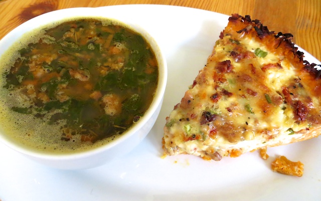 The short menu features omelettes and Highway Crossing oatmeal at breakfast—chased by Fratello coffee or lattes—and chile, sandwiches and quesadillas at lunch. I’m not usually a quiche person but am intrigued by one with sweet potato crust, which indeed is sweet and crumbly soft. The airy quiche is easily matched by the accompanying bowl of spicy soup, chockfull of sausage and greens in a flavourful broth.